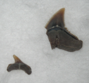種類:Alopias sp. (左下) 採集日:2011年9月25日 採集層:備北層 地質時代:中新世 (Miocene 約2,300万年前~約500万年前) 岩質:泥岩 標本番号:MN-02 レア度:★★★★☆