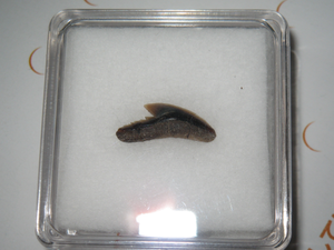 種類:Galeocerdo aduncus 採集日:2010年3月31日 採集層:備北層群 地質時代:中新世 (Miocene 約2,300万年前~約500万年前) 岩質:泥岩 標本番号:MN-01 レア度:★★★★☆
