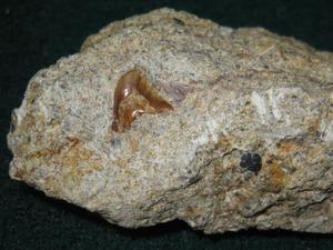 種類:Hemipristis curvatus (カマヒレザメの絶滅種) 採集日:2006年6月6日 採集層:浪形層 地質時代:始新世 (Eocene 約5,600万年前~約3,390万年前) 岩質:貝殻石灰岩 標本番号:MN-02 レア度:★★★★☆