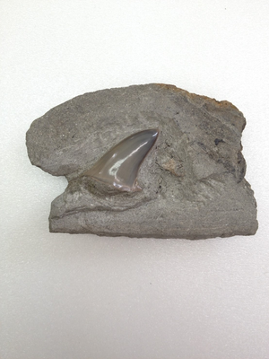 種類:Isurus desri (アオザメの絶滅種) 採集日:不明 採集層:備北層群 地質時代:中新世 (Miocene 約2,300万年前~約500万年前) 岩質:泥岩 標本番号:MN-03