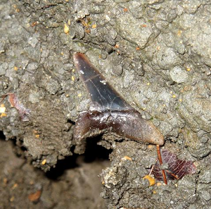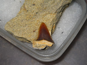 種類:Isurus sp. 採集日:2012年1月31日 採集層:浪形層 地質時代:始新世 (Eocene 約5,600万年前~約3,390万年前) 岩質:砂岩 標本番号:MN-18 レア度:★★★★★